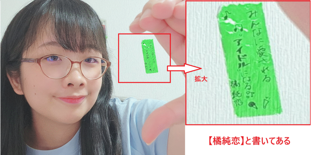 自室で撮ったと思われる自撮りの後ろに、目標を書いた紙に「橘純恋」と書いてありますね。